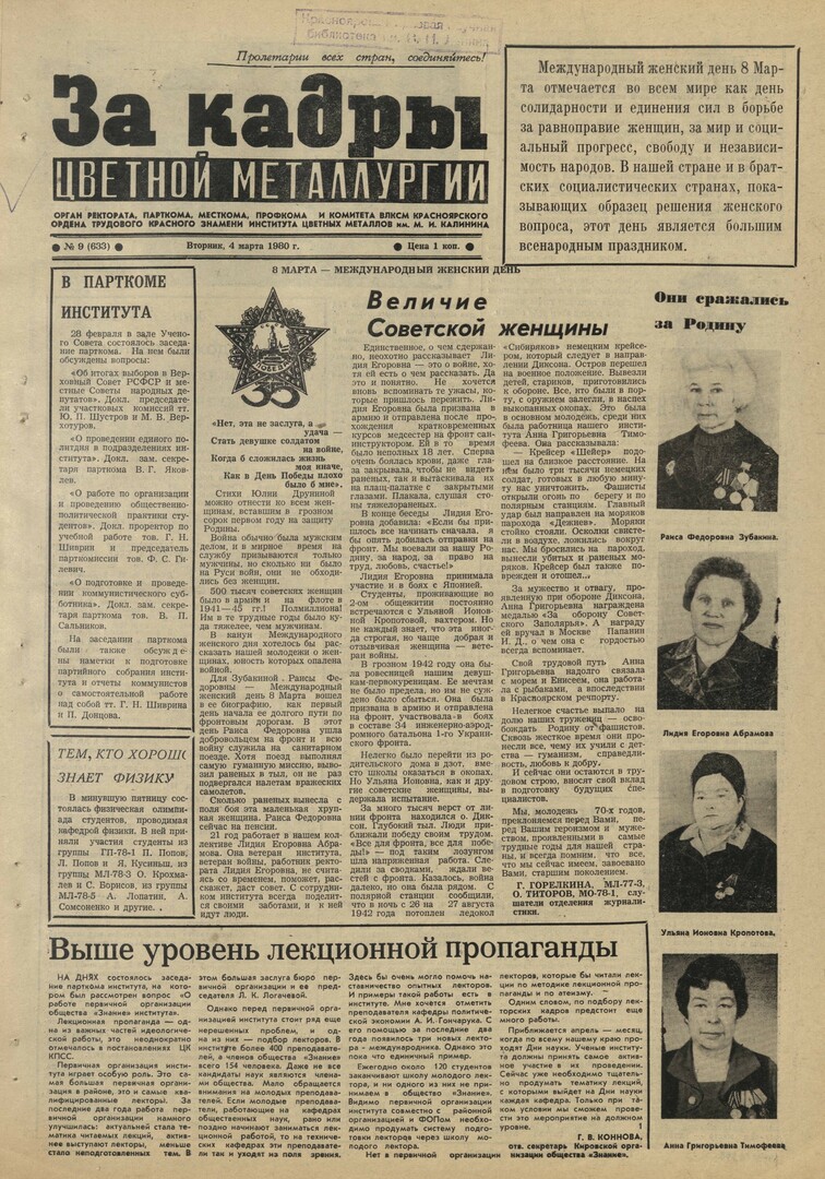 - Величие Советской женщины : [о женщинах, ветеранах ВОВ института]. — С. 1.