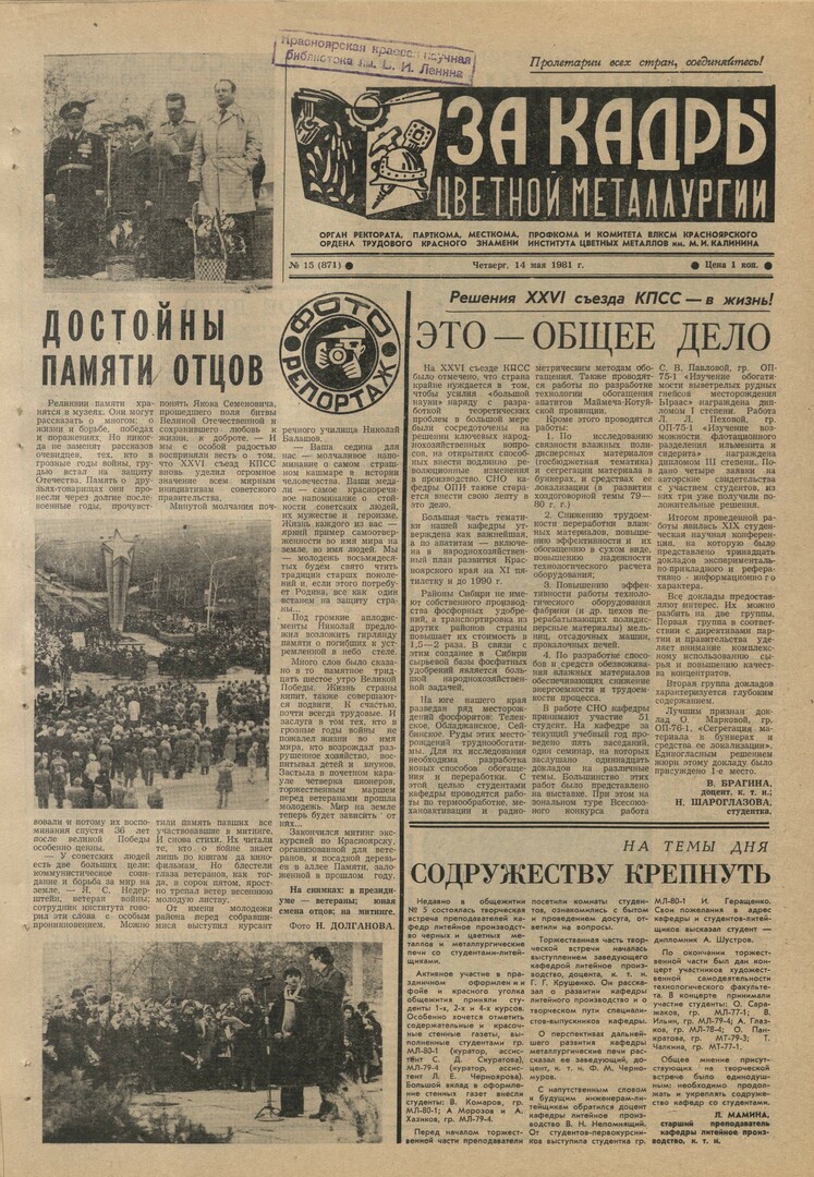 - Содружеству крепнуть : [творческая встреча преподавателей кафедры литейное производство со студентами-литейщиками]. — С. 1.