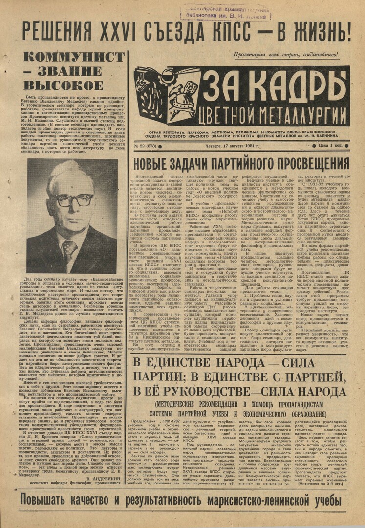 За кадры цветной металлургии : газета. 1981 г. № 22 (878) (17 августа)выпуск журнала/газеты