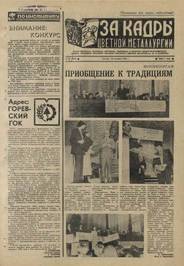 За кадры цветной металлургии : газета. 1981 г. № 27 (882) (22 октября)выпуск журнала/газеты