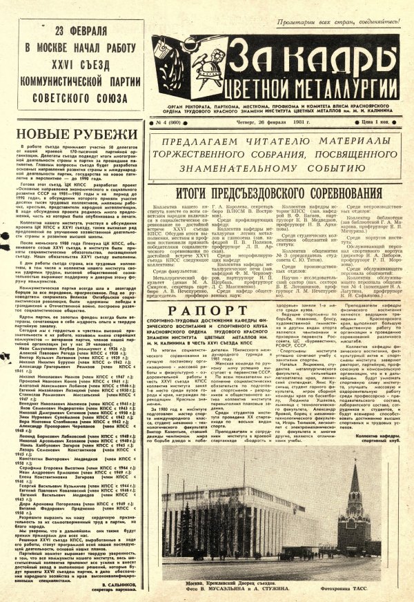 За кадры цветной металлургии : газета. 1981 г. № 4 (860) (26 февраля)выпуск журнала/газеты