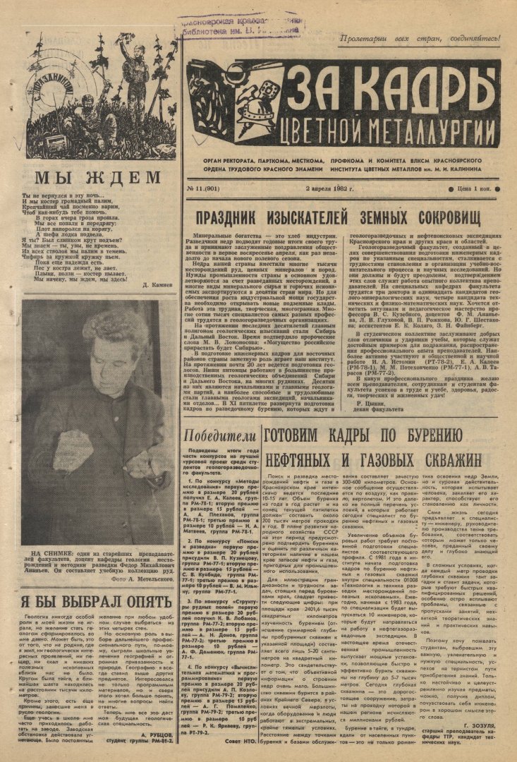- Победители : [итоги конкурса на лучший курсовой проект среди студентов геологоразведочного факультета]. — С. 1.