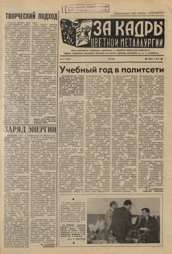 За кадры цветной металлургии : газета. 1982 г. № 17 (907) (28 мая)выпуск журнала/газеты