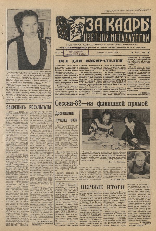 За кадры цветной металлургии : газета. 1982 г. № 18 (908) (11 июня)выпуск журнала/газеты