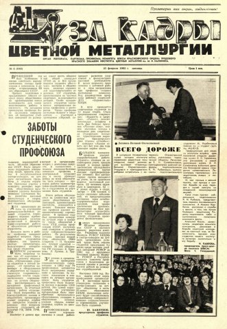 За кадры цветной металлургии : газета. 1983 г. № 3 (940) (25 февраля)выпуск журнала/газеты