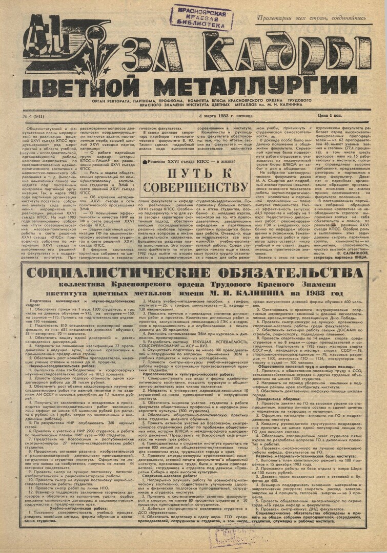 - Социалистические обязательства коллектива Красноярского ордена Трудового Красного Знамени института цветных металлов им. М. И. Калинина на 1983 год. — С. 1.