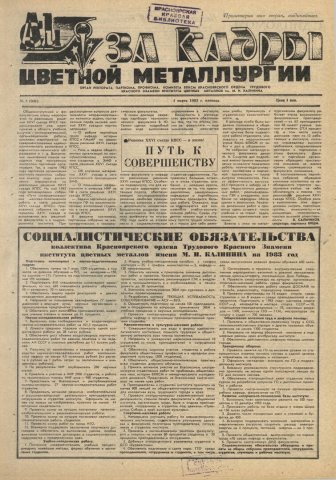 За кадры цветной металлургии : газета. 1983 г. № 4 (941) (4 марта)выпуск журнала/газеты