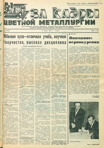 За кадры цветной металлургии : газета. 1984 г. № 1 (1002) (13 января)выпуск журнала/газеты
