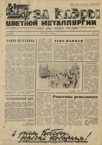 - Положение о 20-м легкоатлетическом эстафетном пробеге на приз газеты "За кадры цветной металлургии" КИЦМ, посвященный Дню Победы. — С. 2.
