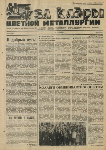За кадры цветной металлургии : газета. 1984 г. № 21 (1021) (22 июня)выпуск журнала/газеты