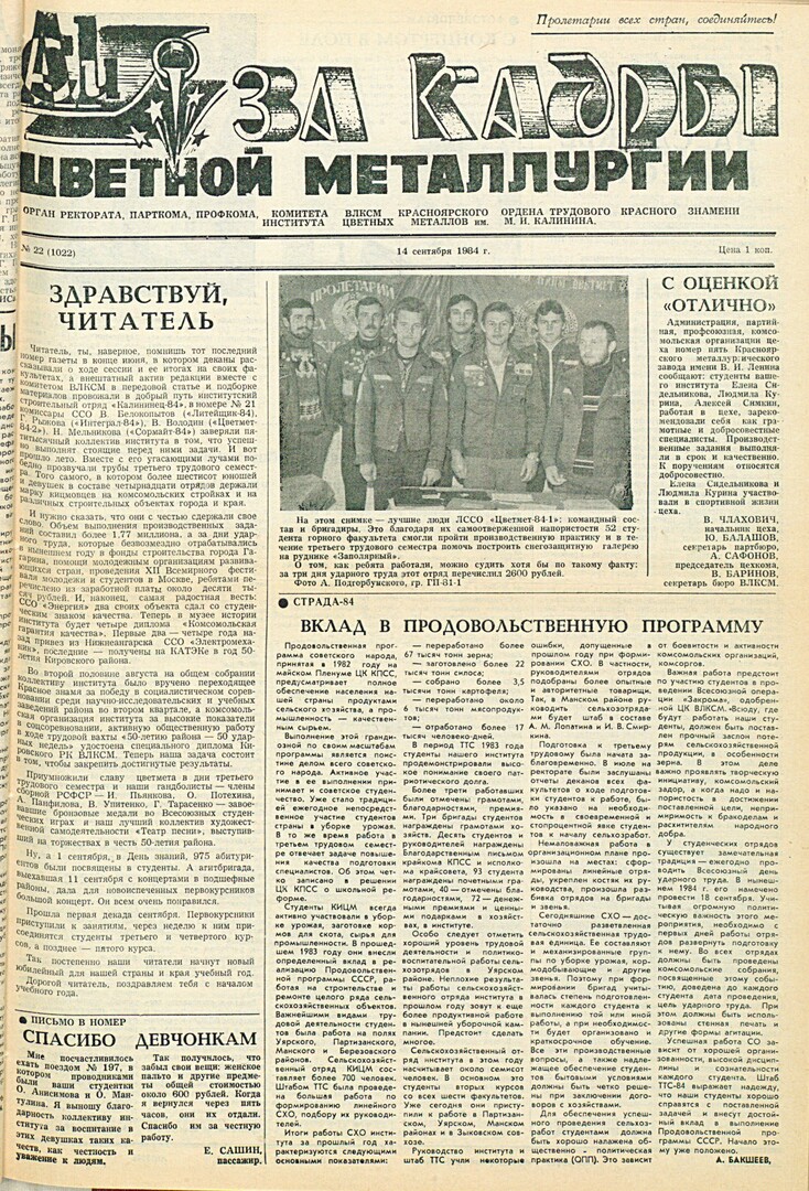 За кадры цветной металлургии : газета. 1984 г. № 22 (1022) (14 сентября)выпуск журнала/газеты
