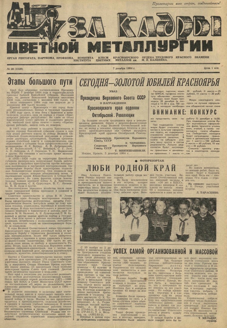 - Указ Президиума Верховного Совета СССР о награждении Красноярского края орденом Октябрьской Революции. — С. 1.