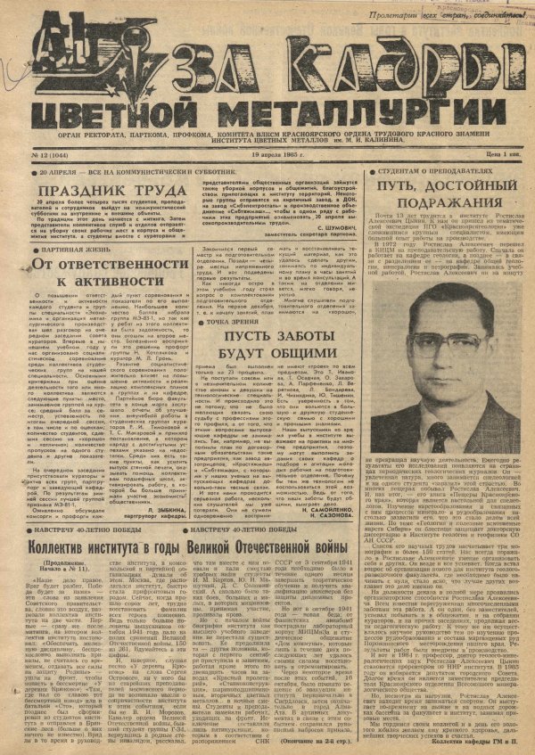 За кадры цветной металлургии : газета. 1985 г. № 12 (1044) (19 апреля)выпуск журнала/газеты