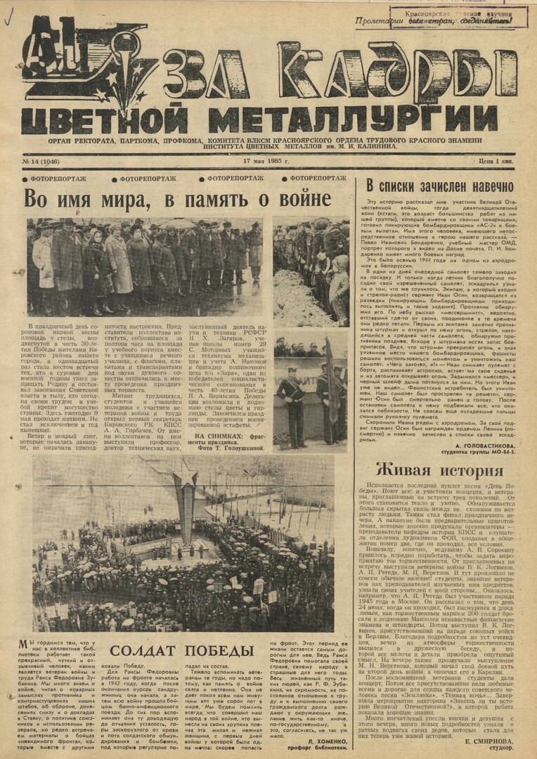 За кадры цветной металлургии : газета. 1985 г. № 14 (1046) (17 мая)выпуск журнала/газеты