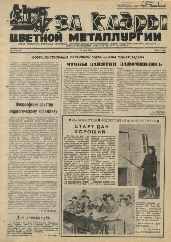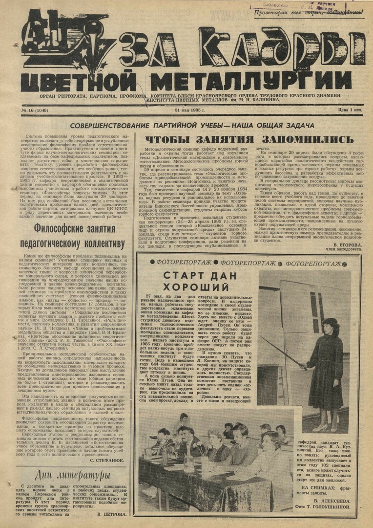 За кадры цветной металлургии : газета. 1985 г. № 16 (1048) (31 мая)выпуск журнала/газеты