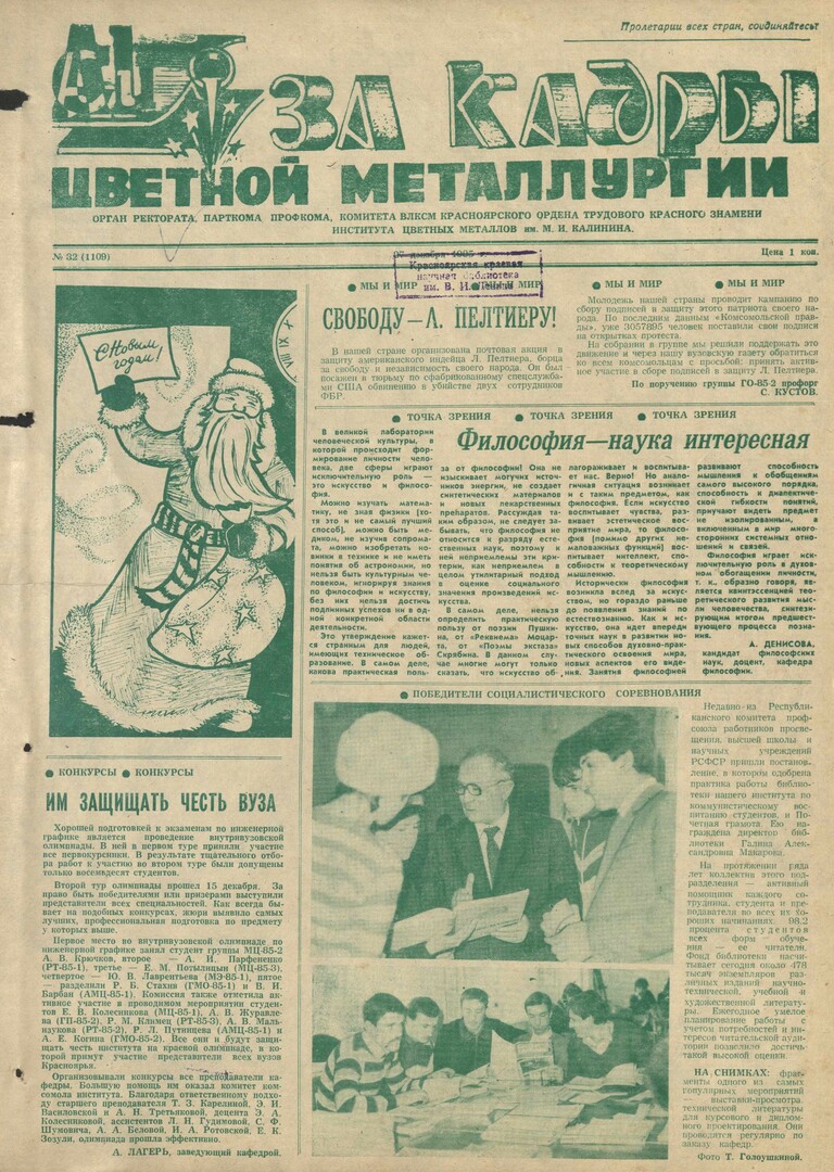 За кадры цветной металлургии : газета. 1985 г. № 32 (1109) (27 декабря)выпуск журнала/газеты
