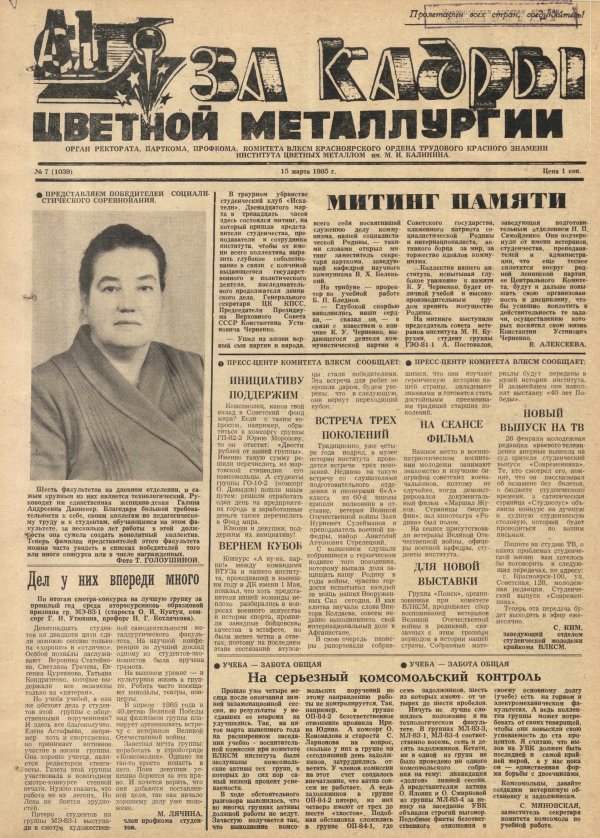 - Митинг памяти : [митинг, посвященный памяти Генерального секретаря ЦК КПСС, Председателя Президиума Верховного Совета СССР К. У. Черненко]. — С. 1.