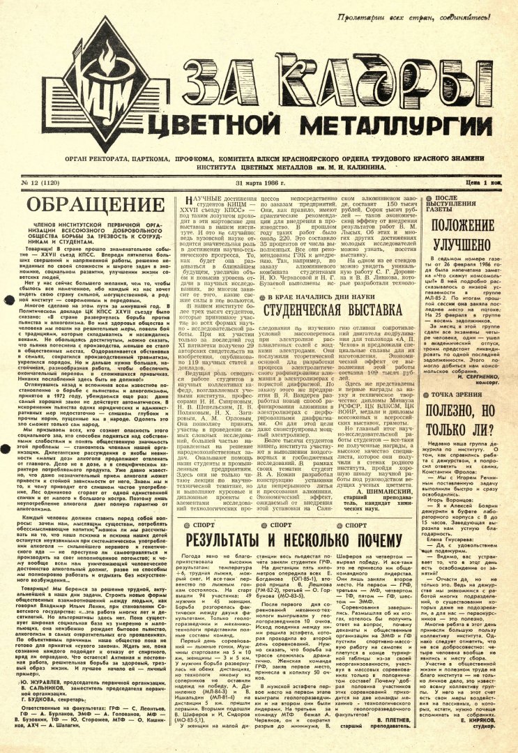 - Обращение членов институтской первичной организации Всесоюзного добровольного общества борьбы за трезвость к сотрудникам и студентам. — С. 1.