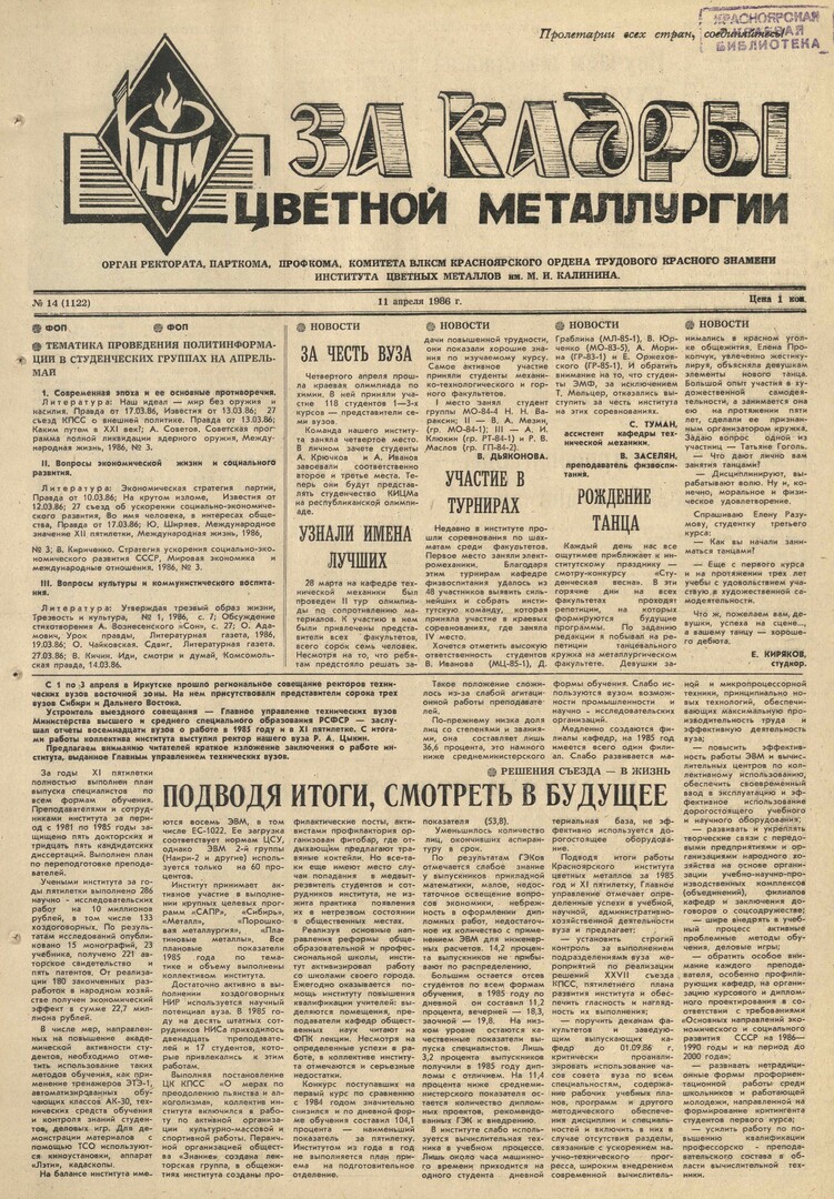 За кадры цветной металлургии : газета. 1986 г. № 14 (1122) (11 апреля)выпуск журнала/газеты