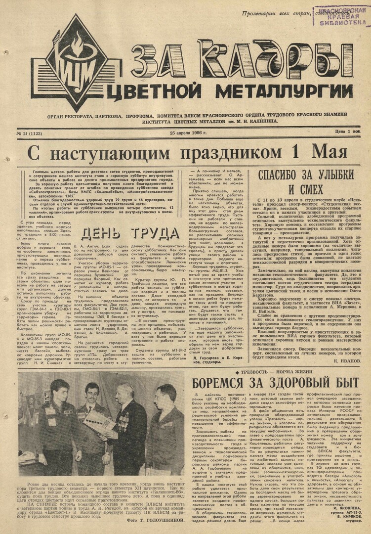 За кадры цветной металлургии : газета. 1986 г. № 15 (1123) (25 апреля)выпуск журнала/газеты