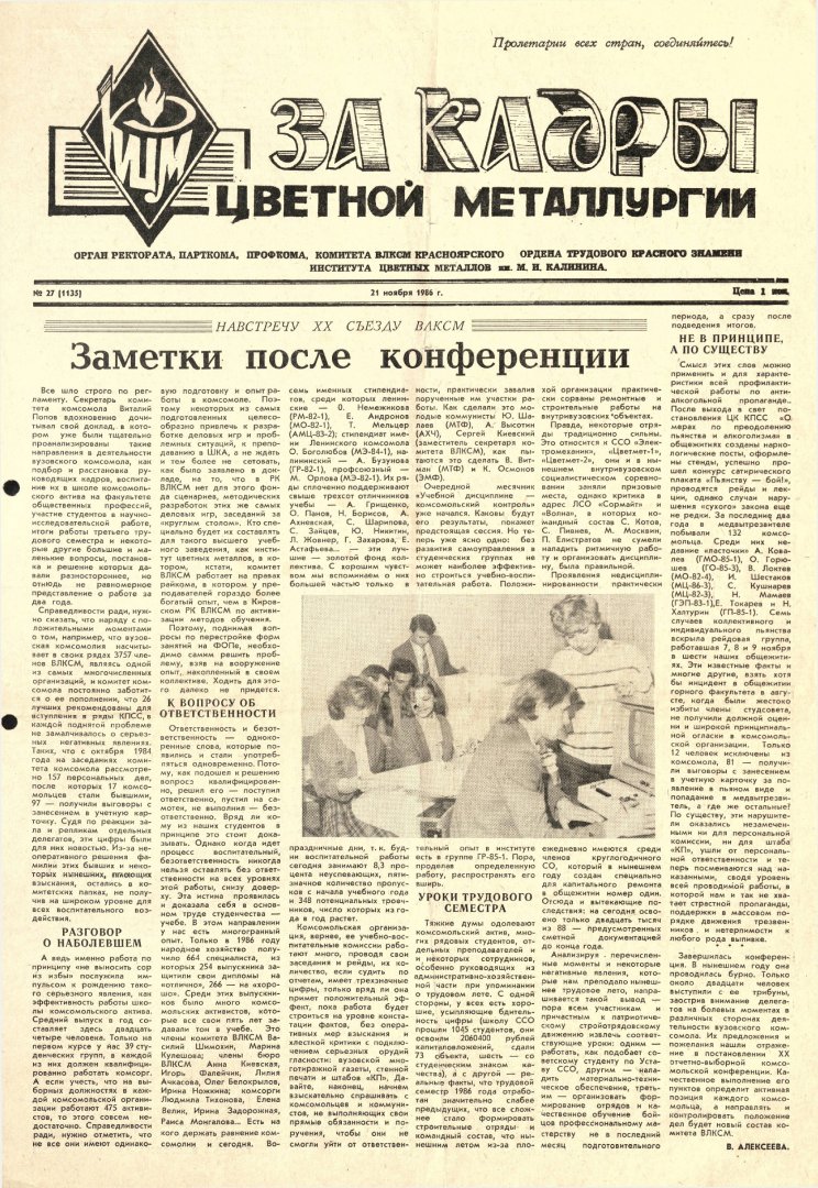 За кадры цветной металлургии : газета. 1986 г. № 27 (1135) (21 ноября)выпуск журнала/газеты