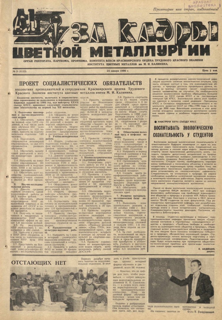 - Проект социалистических обязательств коллектива преподавателей и сотрудников Красноярского ордена Трудового Красного Знамени института цветных металлов имени М. И. Калинина. — С. 1.