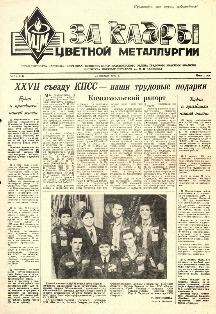 За кадры цветной металлургии : газета. 1986 г. № 6 (1114) (24 февраля)выпуск журнала/газеты
