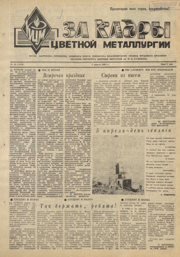 За кадры цветной металлургии : газета. 1987 г. № 12 (1152) (3 апреля)выпуск журнала/газеты