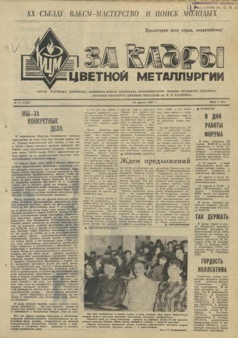 За кадры цветной металлургии : газета. 1987 г. № 13 (1153) (10 апреля)выпуск журнала/газеты