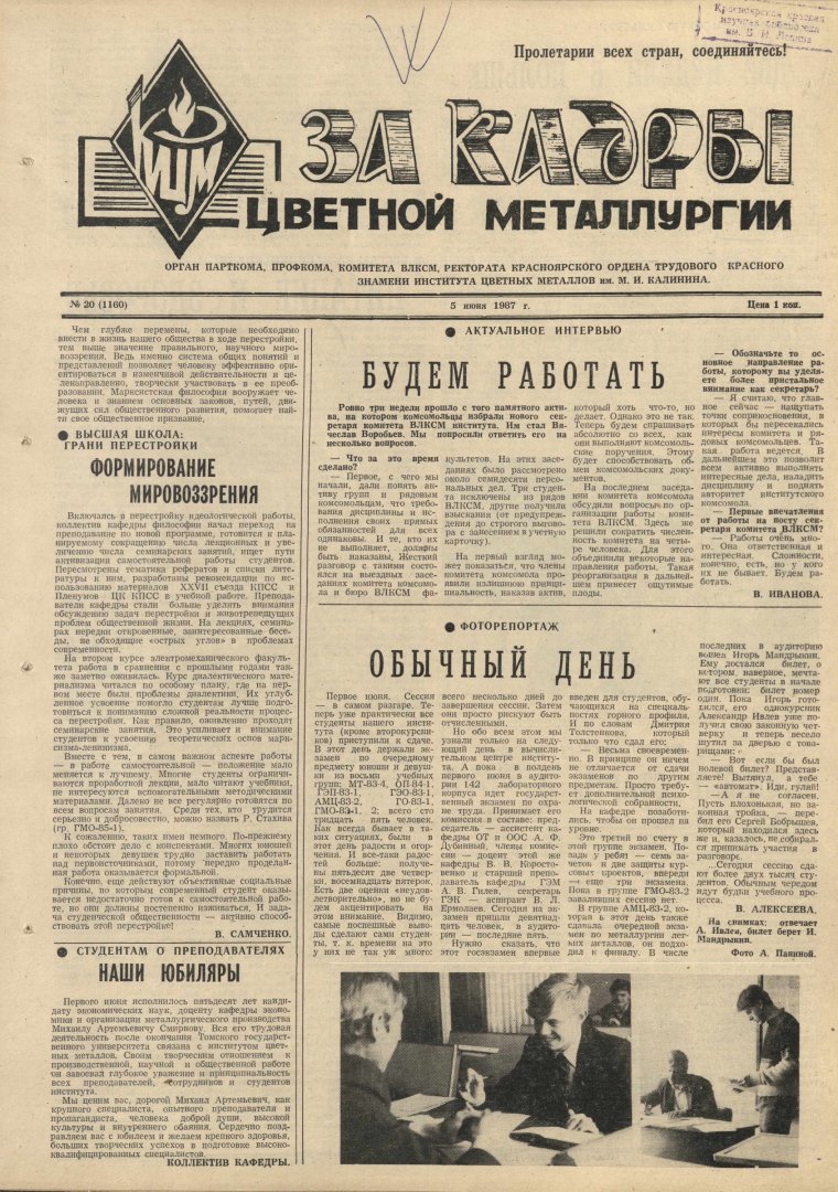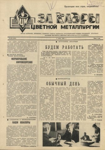 За кадры цветной металлургии : газета. 1987 г. № 20 (1160) (5 июня)выпуск журнала/газеты