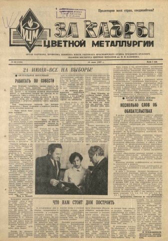 За кадры цветной металлургии : газета. 1987 г. № 22 (1162) (19 июня)выпуск журнала/газеты