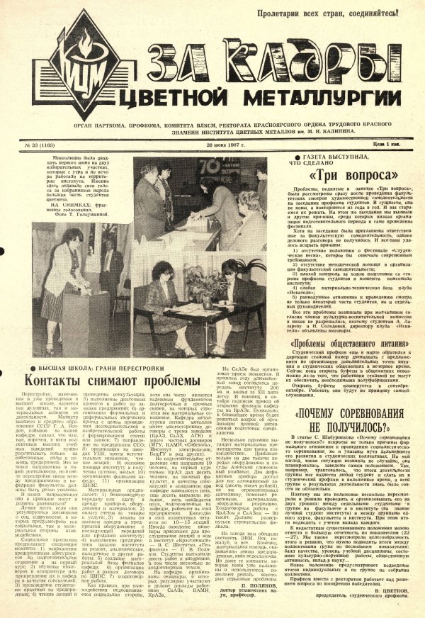 За кадры цветной металлургии : газета. 1987 г. № 23 (1163) (26 июня)выпуск журнала/газеты