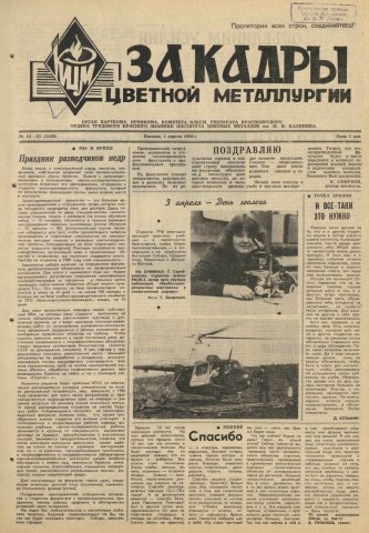 За кадры цветной металлургии : газета. 1988 г. № 12/13 (1188) (1 апреля)выпуск журнала/газеты