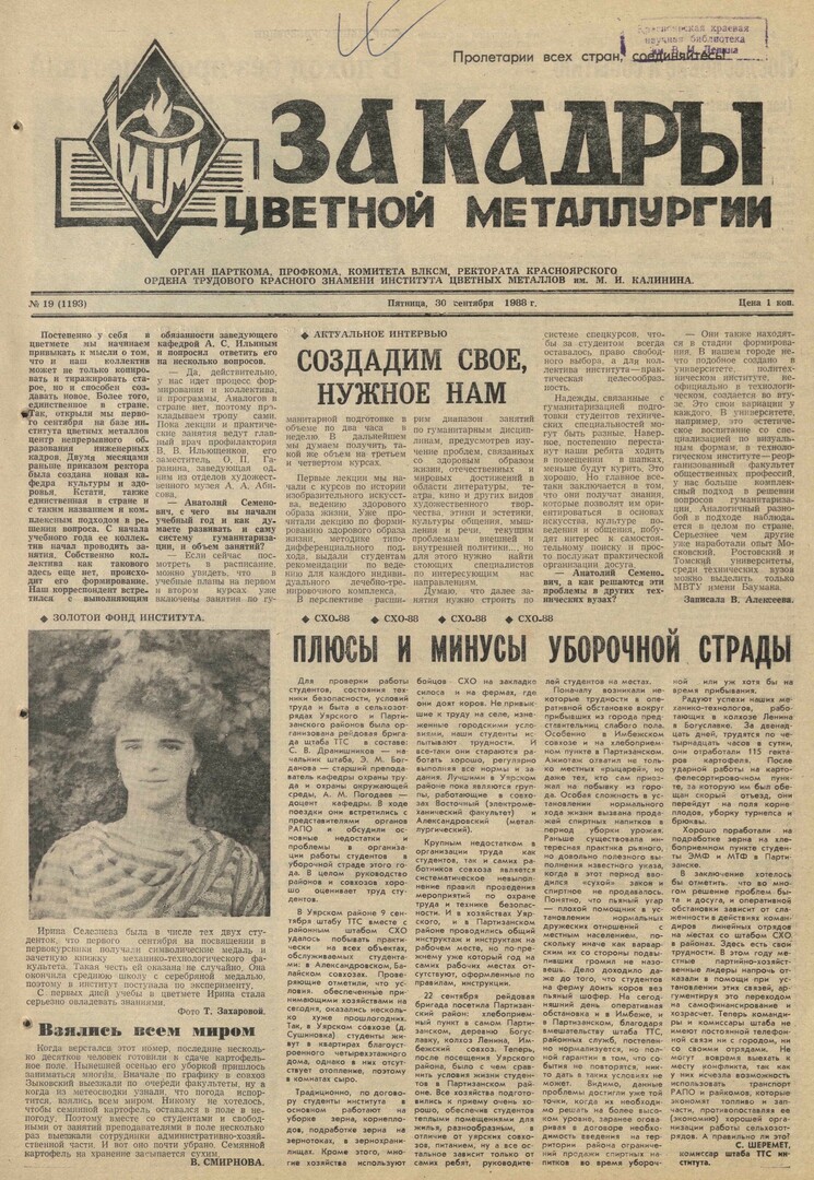 За кадры цветной металлургии : газета. 1988 г. № 19 (1193) (30 сентября)выпуск журнала/газеты