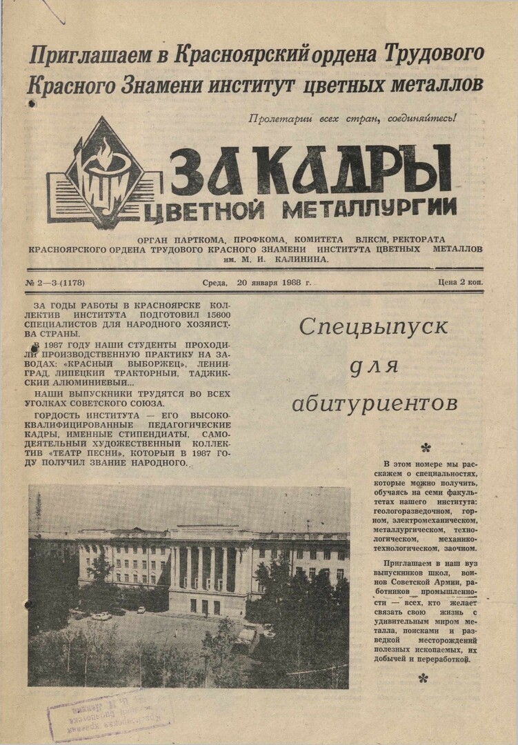 За кадры цветной металлургии : газета. 1988 г. № 2/3 (1178) (20 января)выпуск журнала/газеты
