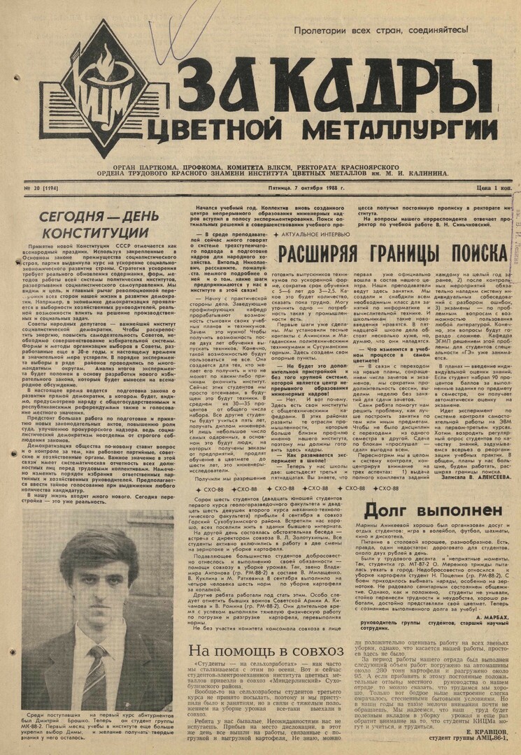 За кадры цветной металлургии : газета. 1988 г. № 20 (1194) (7 октября)выпуск журнала/газеты