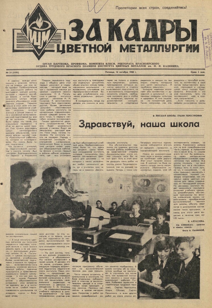 За кадры цветной металлургии : газета. 1988 г. № 21 (1195) (14 октября)выпуск журнала/газеты