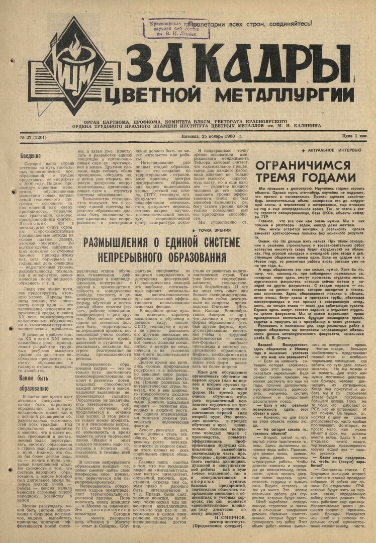 За кадры цветной металлургии : газета. 1988 г. № 27 (1201) (25 ноября)выпуск журнала/газеты
