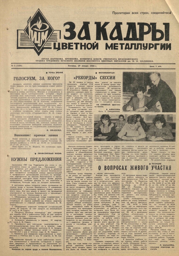 За кадры цветной металлургии : газета. 1988 г. № 5 (1180) (29 января)выпуск журнала/газеты