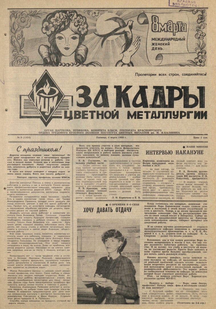 За кадры цветной металлургии : газета. 1988 г. № 9 (1184) (4 марта)выпуск журнала/газеты
