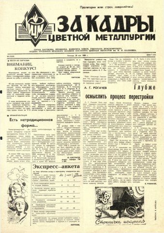 За кадры цветной металлургии : газета. 1989 г. № 18 (1223) (28 мая)выпуск журнала/газеты
