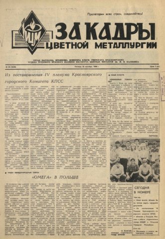 За кадры цветной металлургии : газета. 1989 г. № 25 (1230) (22 сентября)выпуск журнала/газеты