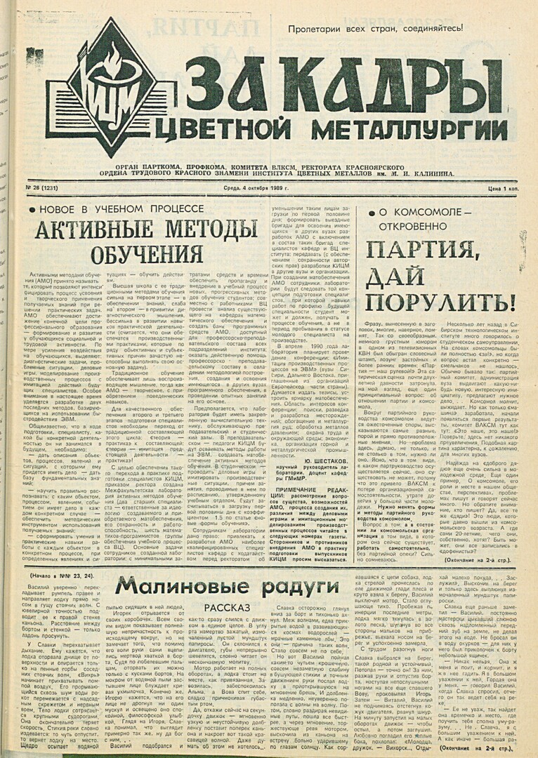 За кадры цветной металлургии : газета. 1989 г. № 26 (1231) (4 октября)выпуск журнала/газеты