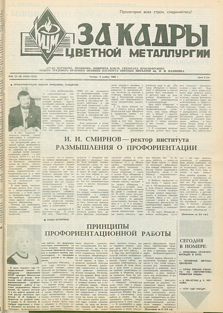 За кадры цветной металлургии : газета. 1989 г. № 27/28 (1232-1233) (9 ноября)выпуск журнала/газеты