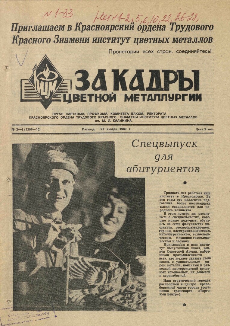 За кадры цветной металлургии : газета. 1989 г. № 3/4 (1209-1210) (27 января)выпуск журнала/газеты