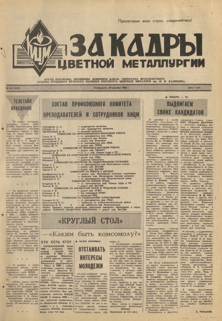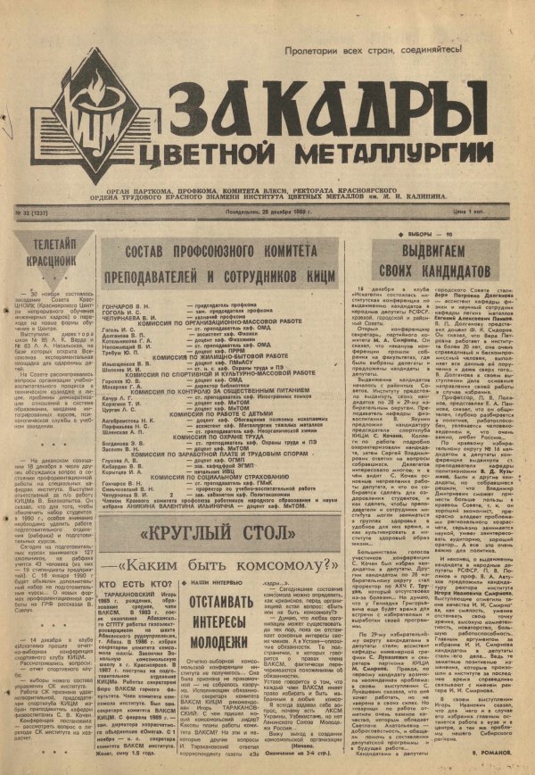 За кадры цветной металлургии : газета. 1989 г. № 32 (1237) (25 декабря)выпуск журнала/газеты