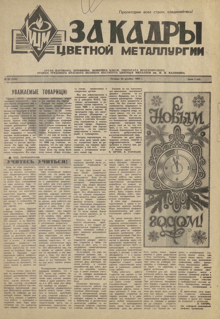 За кадры цветной металлургии : газета. 1989 г. № 33 (1238) (29 декабря)выпуск журнала/газеты