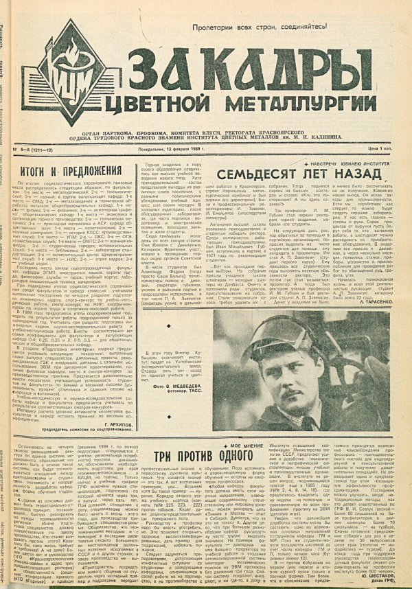 За кадры цветной металлургии : газета. 1989 г. № 5/6 (1211-1212) (13 февраля)выпуск журнала/газеты
