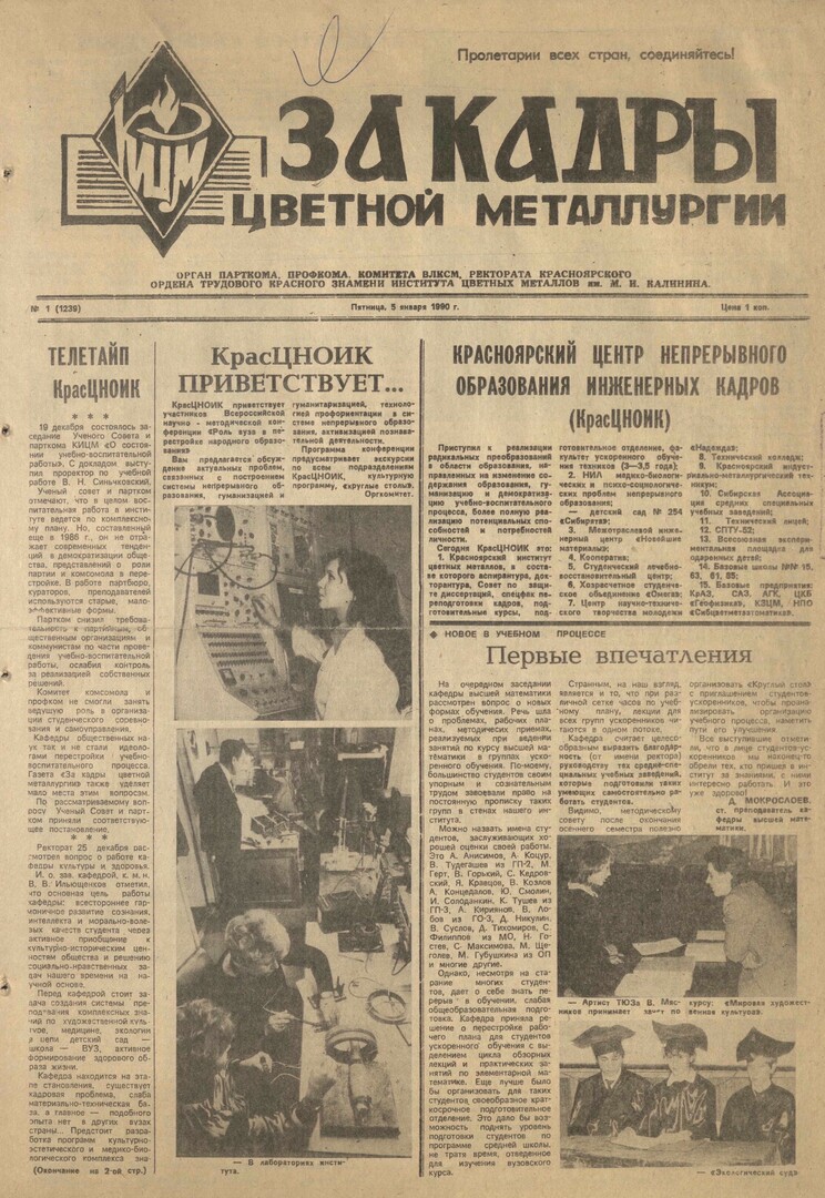 - Телетайп КрасЦНОИК : [заседание Ученого Совета (19 декабря) : вопрос о работе кафедры культуры и здоровья на ректорате (25 декабря) : вопрос о состоянии эксперимента "школа - ВУЗ" на педсовете (30 декабря)]. — С. 1,2.
