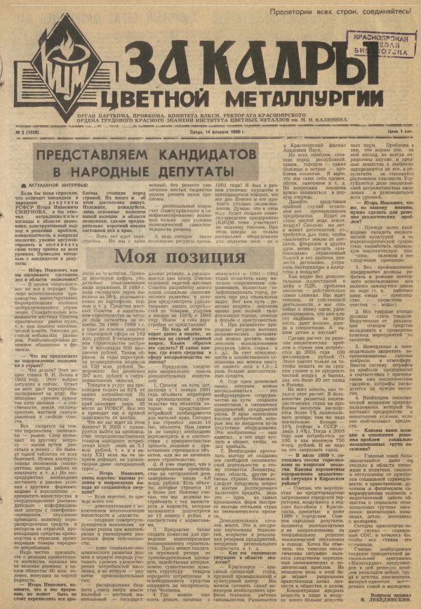 За кадры цветной металлургии : газета. 1990 г. № 2 (1236) (14 февраля)выпуск журнала/газеты